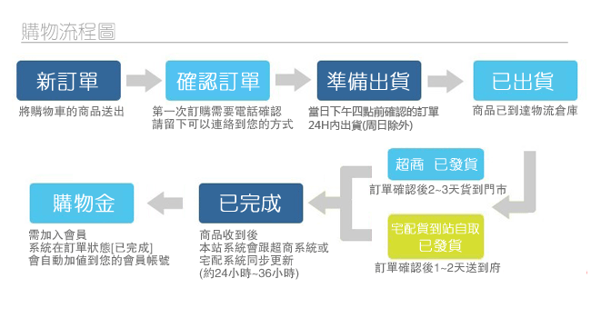 6.星期五、六下午12點後之訂單,因宅配公司星期六日休假(暫停出貨服務),延後至星期一處理,敬請見諒。